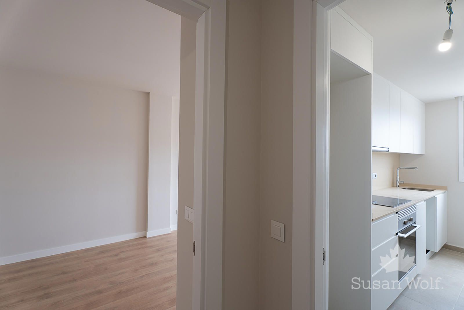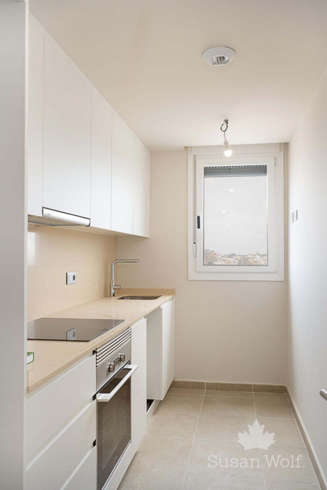 Cocina amueblada, equipada con placa de inducción, campana extractora y horno.